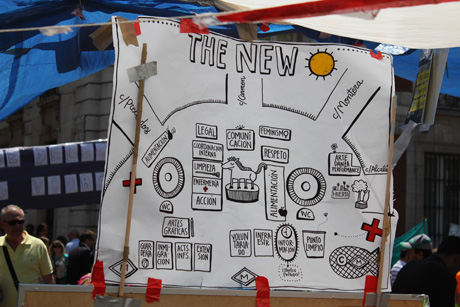A giant L’Oréal billboard towering over the square was defaced by a huge banner affirming ‘No nos representan’ (they do not represent us), and the camp soon filled with thousands of hand-written placards, banners and post-its, while political and union flags were banned.